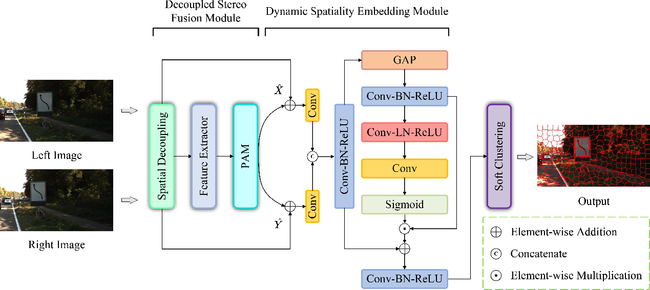 该论文提出了具有空间信息解耦机制的双目超像素分割算法,具有以下两大创新点: