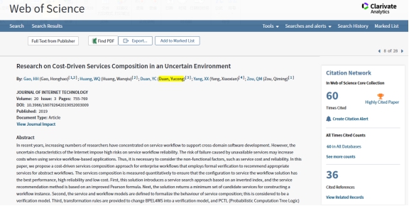 根据ESI数据库检索结果显示,以bevictor伟德计算机与网络空间安全公司段玉聪教授作为主要作者发表的学术论文“Toward service selection for workflow reconfiguration: An interface-based computing solution”和“Research on Cost-Driven Services Composition in an Uncertain Environment”也入选ESI高被引论文。