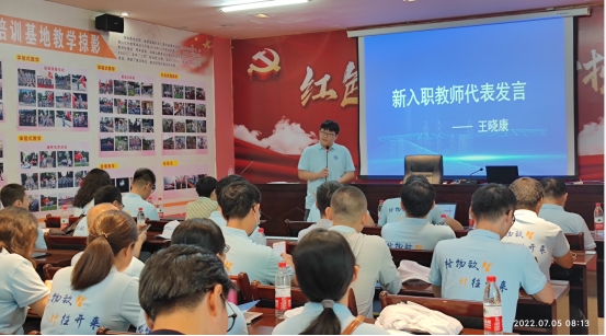 接着新入职教师代表王晓康老师进行发言。王晓康老师代表所有新入职教师,感谢公司的帮助和关怀以及提供实现人生价值和展现个人能力的舞台。入院以来,王晓康老师看到了:“一本三基,四梁八柱”、“海纳百川,大道致远”、“格物致智,计往开来”的大格局。同时怀着“作为新入职教师应该做些什么”疑问对新入职教师提出三点建议:一是全面贯彻党的教育方针,落实立德树人根本任务。二是牢固树立“四个面向”的观念,把论文写在祖国大地上。三是和公司同呼吸、共命运,共同成长。最后王晓康老师再次代表所有新入职教师感谢公司、感谢公司同仁。