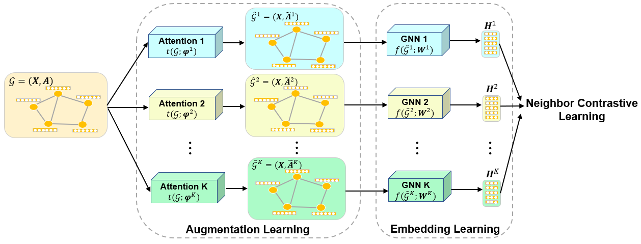 1)现有的图对比学习方法通常采用人为设计的图增强策略,需要手动为每个图数据集选择合适的图增强参数,极大限制了图对比学习方法的效率和泛化能力。该论文提出的NCLA算法,采用多头图注意力机制端对端地自动学习图增强参数,可自动兼容到不同的图数据集,具有更强的泛化能力。另外,相比于人为图增强策略,论文提出的基于注意力机制的可学习图增强方案更安全,可在不破坏下游任务相关信息的条件下,生成具有一定差异性的增强视图。