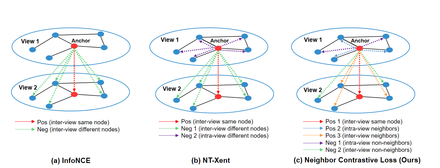 图2:NCLA提出的邻居监督图对比损失与CV领域的InfoNCE和NT-Xent对比损失的对比