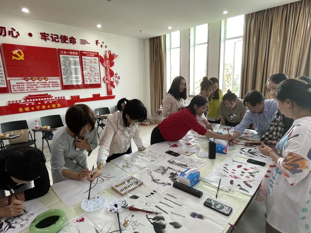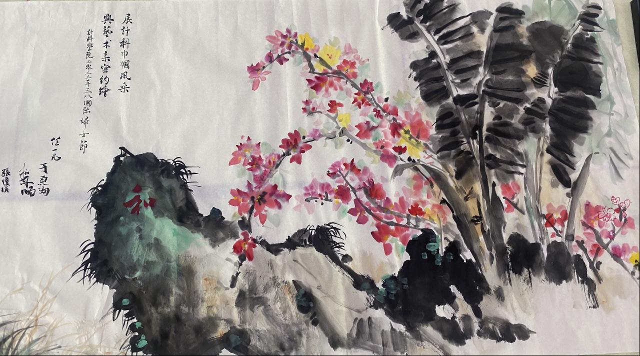 公司工会邀请了美术与设计公司的郭博文老师,指导女老师们的国画绘画基础,并带领大家共同绘制了一幅海大美景。别看我们理工科的女老师们平时都只是和代码、数据打交道,拿起画笔来也依旧风采奕奕。大家专注地跟着郭老师学习如何用墨调彩、如何中锋执笔勾画线条轮廓、如何侧锋运笔表现虚实浓淡,然后又通过临摹郭老师的作品练习花草画法,最后,在郭老师的带领下,大家你点一抹红,她描一叶青,香凝三角梅花蕊,翠落大叶芭蕉身,苔痕映石绿,燕草如碧丝......任一凡老师还在石上写下一个漂亮的“和”字,一幅海大校园小景顿时跃然纸上。