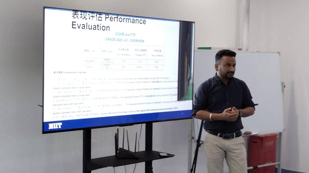 会上,NIIT方丁联铭先生就目前合作现状、红帽认证、人才培养成效进行阐述。接着NIIT方 Santy老师就上学期教学成果进行了详细汇报。