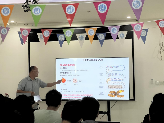 彭云辉副研究员现为华中师范大学物理科学与技术公司硕士生导师,长期致力于生物物理、凝聚态软物质物理及生物信息学等领域的研究工作,发表了40余篇高水平SCI论文,并主持了多项国家自然科学基金等项目。此次报告中,彭老师通过深入浅出的讲解,全面阐述了染色质结构与功能的前沿研究进展。报告围绕染色质结构与功能的计算研究展开,重点介绍了三个研究方向:组蛋白癌突变对核小体结构和功能的影响、核小体与先锋转录因子的相互作用以及染色质中的静电相互作用。他深入解析了癌症突变对核小体结构的破坏性影响及其对基因表达的调控机制,揭示了先锋转录因子通过结合染色质开放区域激活基因表达的过程,并通过计算模拟分析了染色质中静电相互作用对结构稳定性的影响。这些研究为理解癌症发生、基因调控以及染色质结构的动态变化提供了新的视角和理论支持。
