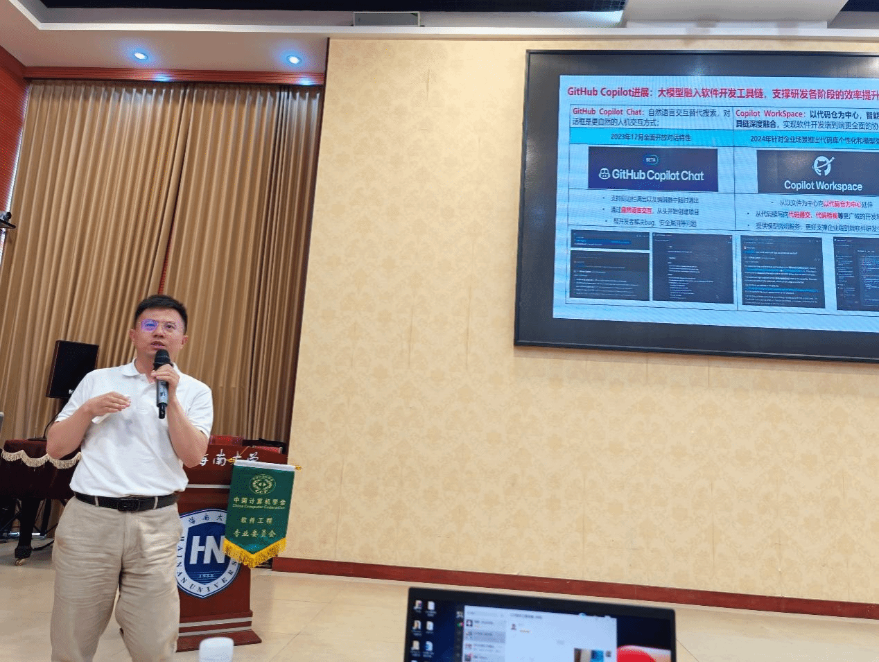 开幕式上,谢夏代表公司向大会致词,对全体与会嘉宾和师生的到来表示欢迎和感谢。受邀嘉宾马晓星、彭鑫、梁广泰分别以《管窥智能化软件》、《迈向更高层次智能化的生成式软件开发》、《华为云智能开发辅助技术实践与分享》为题进行了精彩的讲座,并就相关问题与师生展开了深入交流。会议设置提问环节,同学们积极提问,现场反响热烈。