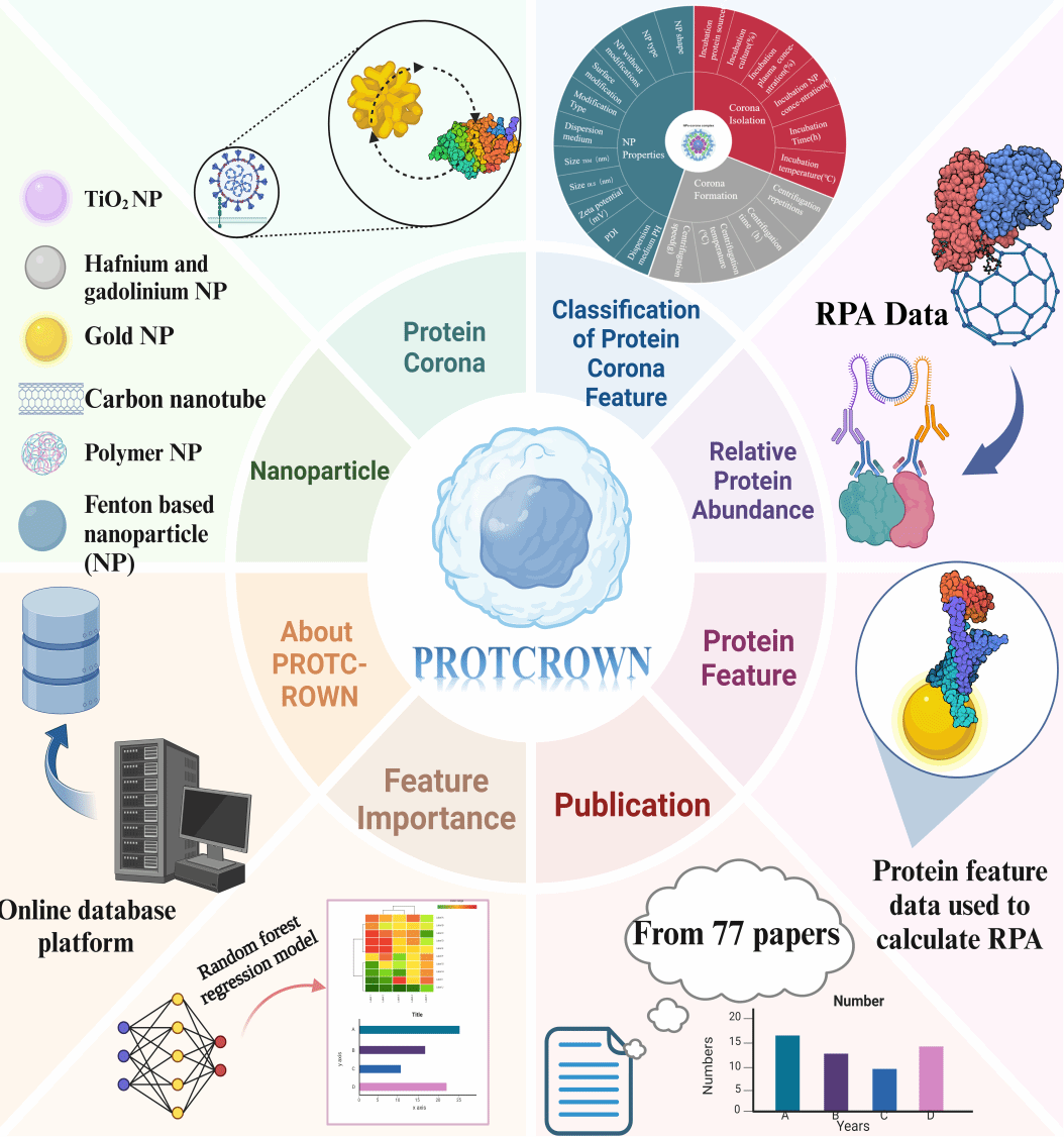 在本研究中,构建了世界首个蛋白冠数据库。蛋白冠是生物信息学和纳米技术领域,特别是在纳米医学递送和纳米颗粒——有机体相互作用研究中的一个关键概念。深入研究蛋白冠对于理解纳米颗粒的生物效应及其在医学等领域的潜在应用具有重要意义。为了进一步研究和理解纳米颗粒与生物系统之间的复杂相互作用,我们建立了PROTCROWN——首个蛋白冠数据库(http://www.protcrown.cn/)。该数据库在系统地收集和整理与蛋白冠相关的数据,为研究人员提供便捷的数据查询平台,并支持数据可视化和分析。