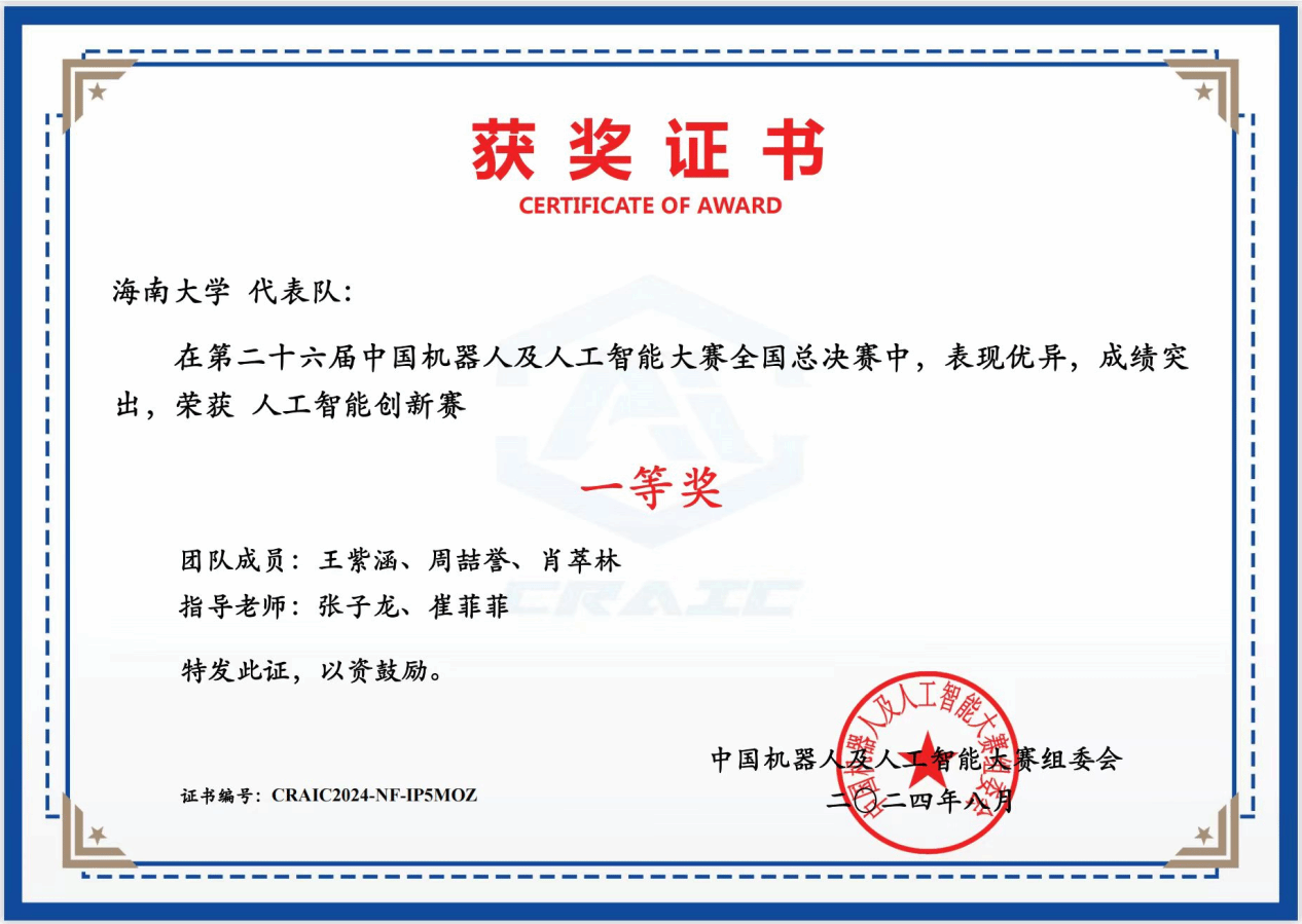 2024年8月24-26日 由中国机器人及人工智能大赛组委会办的2024年(第26届)中国机器人及人工智能大赛全国决赛通过“线上+线下”的形式圆满结束。在伟德体育黎才茂老师的指导本科生潘羽昕潘羽晨刘柳志组成的员工团队,最终荣获该赛事创新赛-新质生产力创新设计专项赛道全国一等奖张子龙老师和崔菲菲老师的指导本科生王紫涵周喆誉肖萃林组成的员工团队,最终荣获该赛事创新赛-人工智能创新专项赛道全国一等奖.