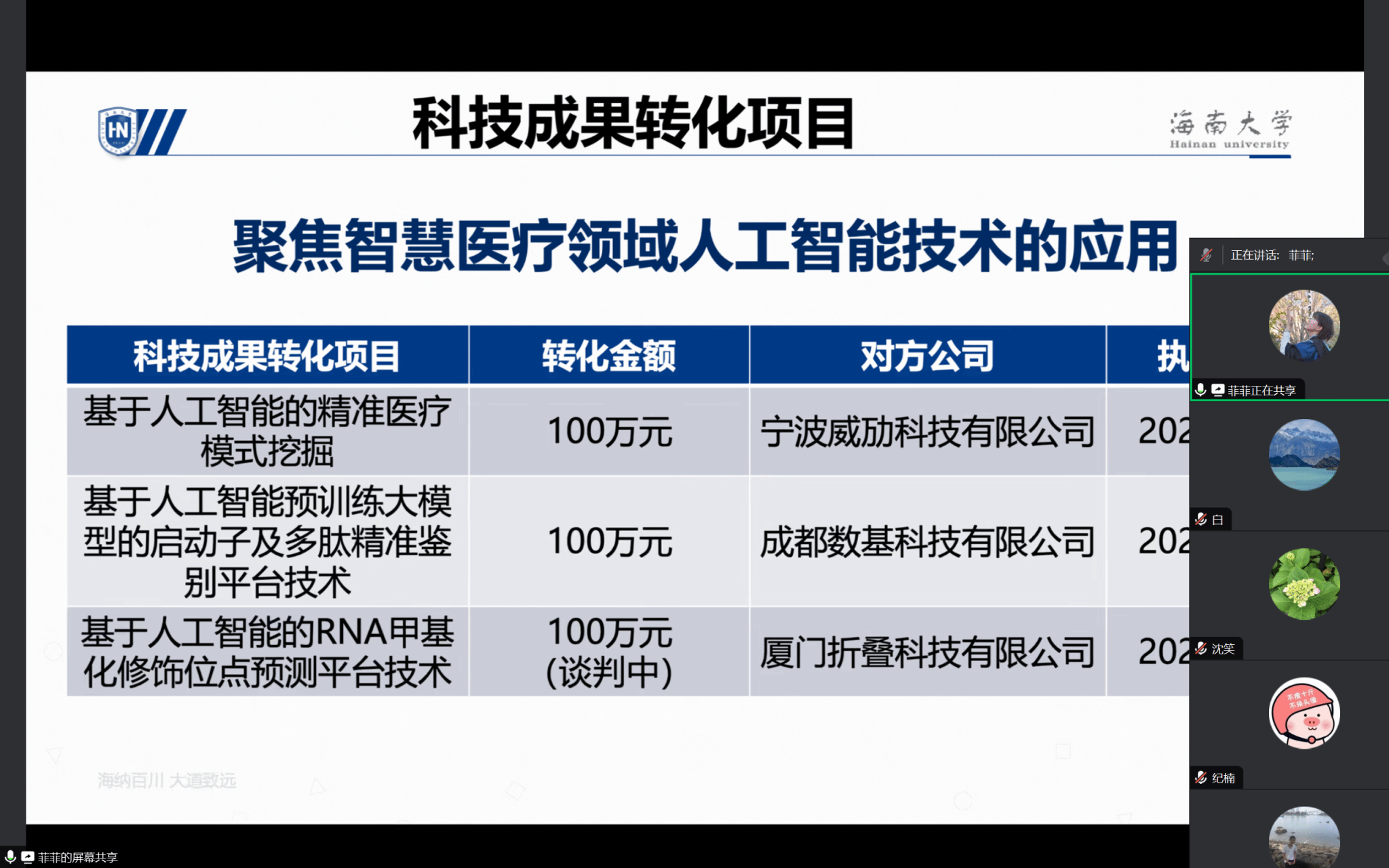 接下来,由公司崔菲菲老师分享个人成果转化的经验。首先,崔老师介绍了个人的国家发明专利情况,并介绍如何通过已有的国家发明专利进行成果转化。据悉,崔老师在2024年已经成功完成两个成果转化,合同金额共计200万元。其次,崔老师介绍了自己目前的科研方向,以及如何将科研和企业的需求进行结合,从而有利于后续产学研合作或国家专利成果的转化。随后,崔老师介绍了公司关于成果转化相关的审批流程。